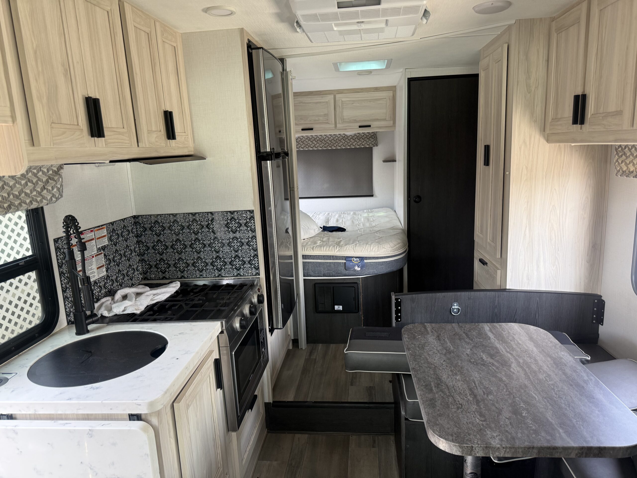 Stepping inside our 25′ Forest River F-E350, you will immediately notice the alluring design of the interior décor, the LED lighting, and the pleated shades! Above the spacious cab is a loft bed with TV.
