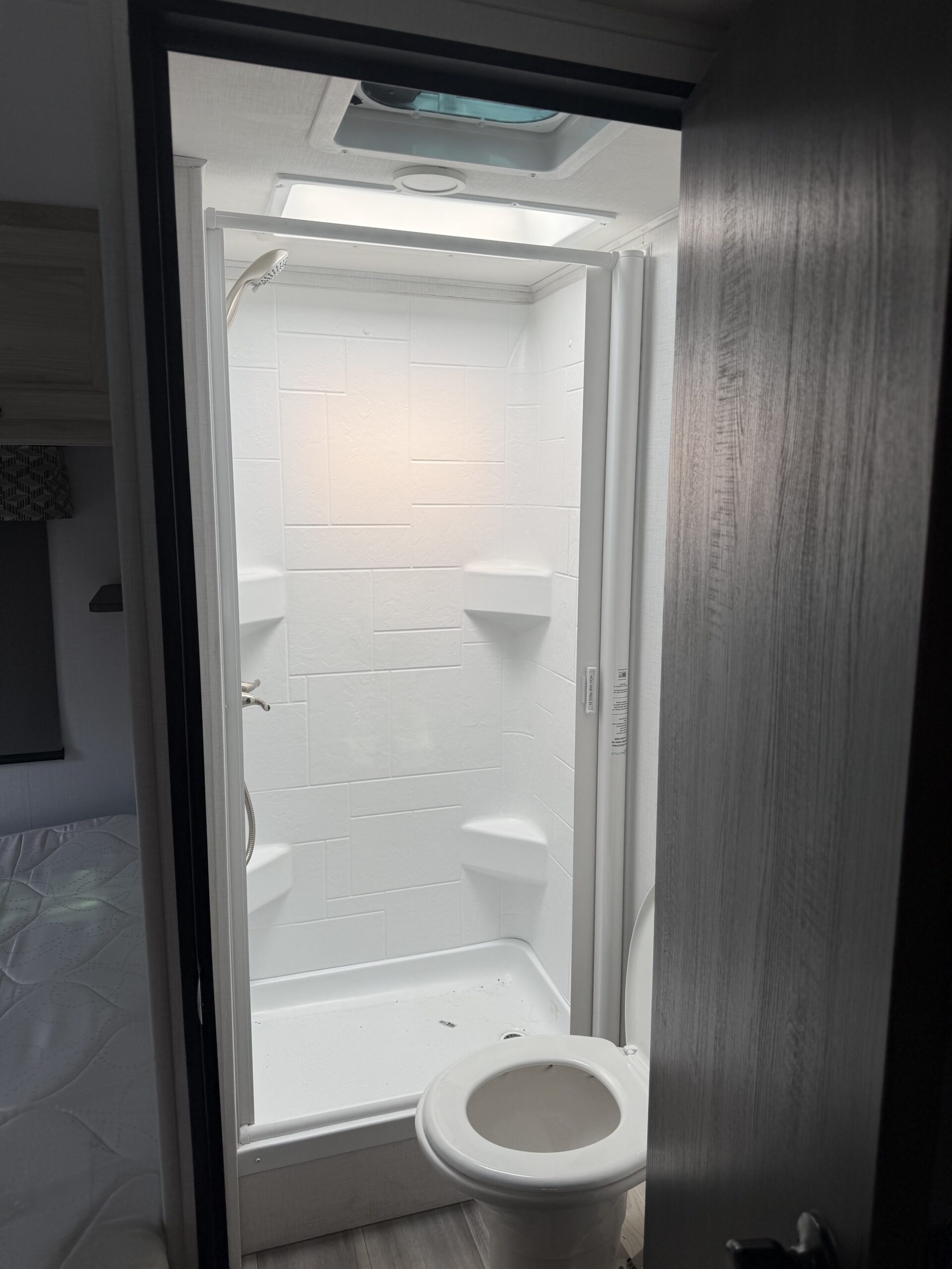 Across from the kitchen is a booth dinette that converts into a small sleeping area! The booth dinette is cozy, comfy, and a great place to gather with the family at the end of the day. At the rear, next to the bed, is the bathroom! It includes all you need for getting ready in the morning. You’ll have a shower, a sink, a foot flush toilet and a mirrored medicine cabinet.